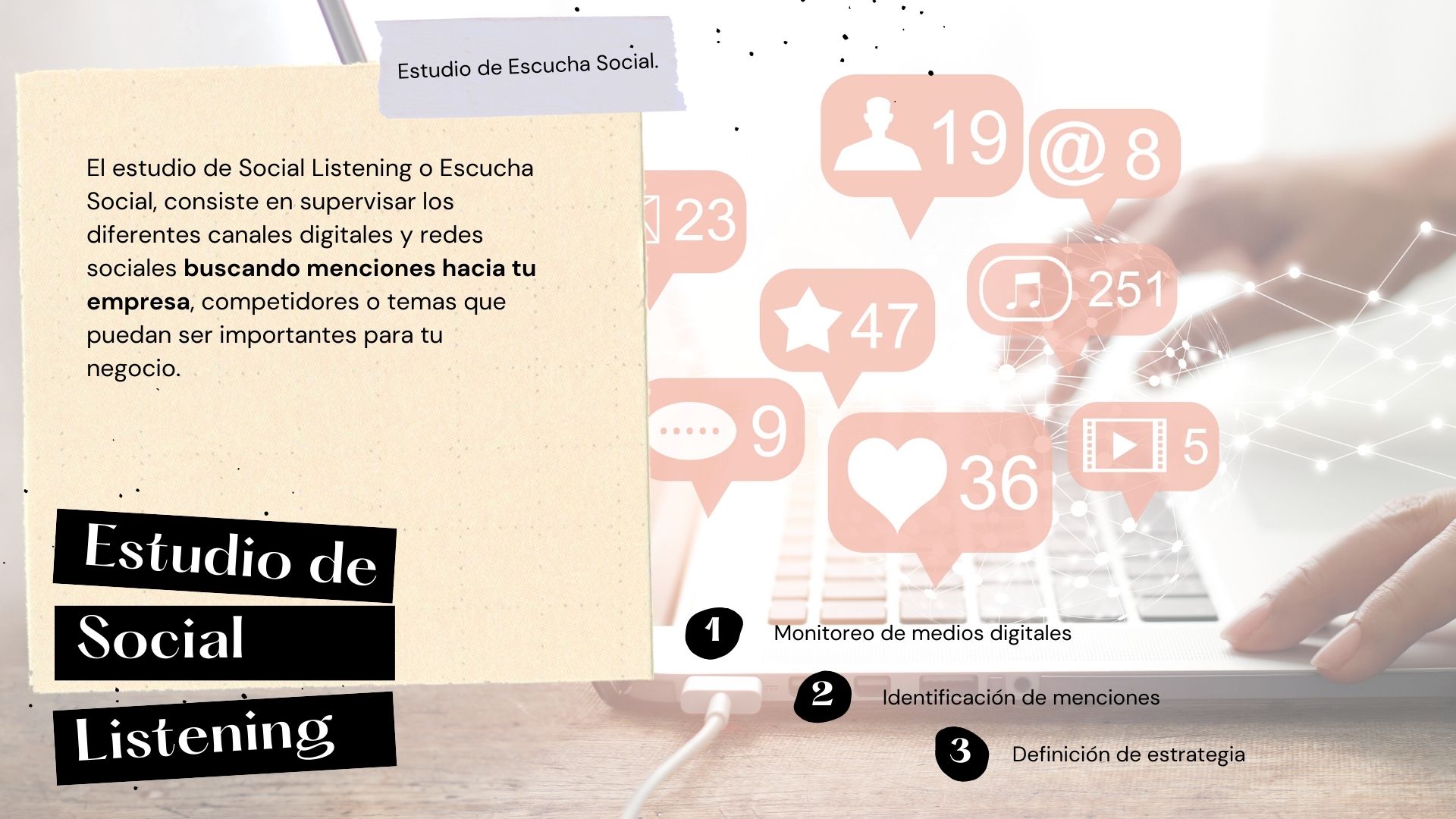 Consiste en supervisar las conversaciones y menciones alrededor de tu marca que tienen lugar en las redes sociales. Pero también incluye otros aspectos como lo que dice tu competencia así como productos, servicios, ideas o temas que estén relacionados con tu marca.